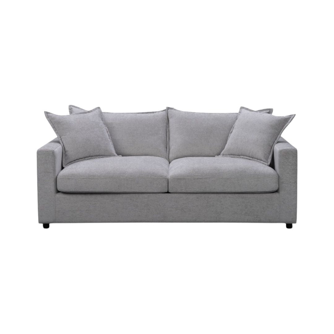 Upholstered in a soft, textured fabric blend and supported by a sturdy plywood frame, this sofa bed is built for durability without compromising on style. Two loose flange-edged back cushions and feather-filled scatter cushions are included, adding an extra layer of comfort and relaxed elegance.
